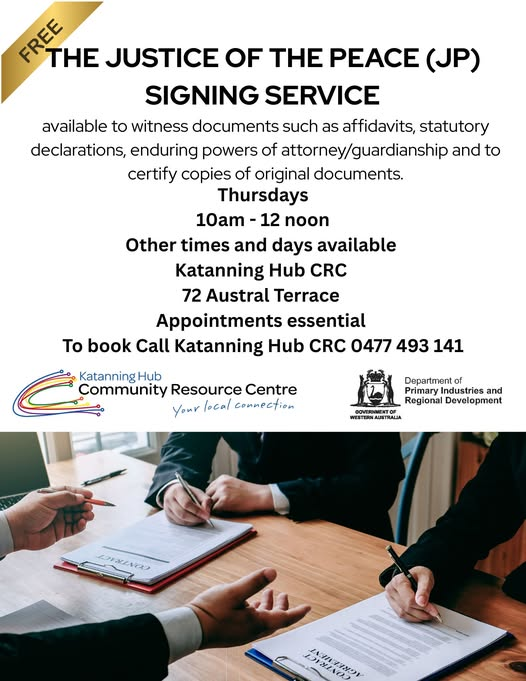 A Justice of the Peace is available every Thursday, 10am–12pm at the Katanning Hub CRC.72 Austral Terrace – Bookings required
